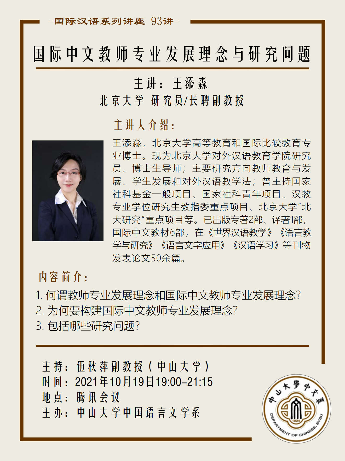 国际汉语系列讲座93讲|王添淼研究员/长聘副教授:国际中文教师专业发展理念与研究问题